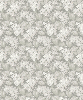 Non-woven wallpaper for the wall, grey background, blooming lilac pattern in shades of grey-beige.