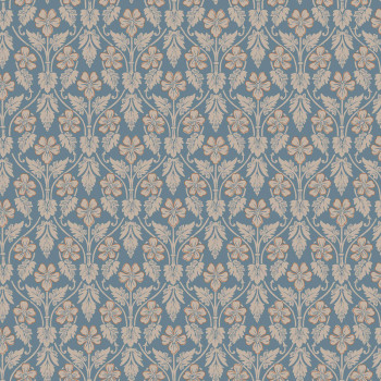 Wallpaper with a blue background, floral pattern with Art Nouveau elements – flowers in warm grey-beige tones, highlighted with golden-brown contours.