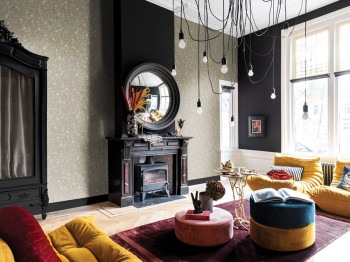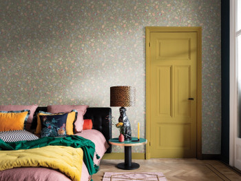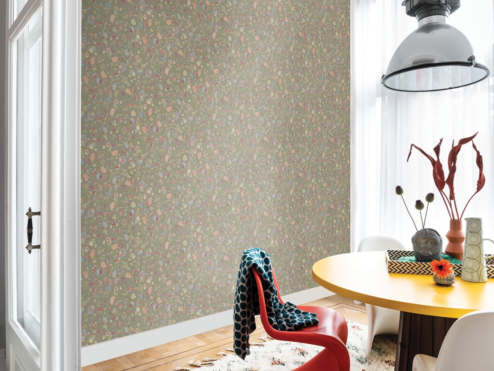 3PCS IN STOCK NEXT UP TO 14 DAYS Gentle floral, ornamental, pattern will add a feminine softness and romantic touch to austere interior. Khaki background, pattern in shades of green, blue, pink. Non-woven wallpaper with a vinyl surface, fine grain texture.