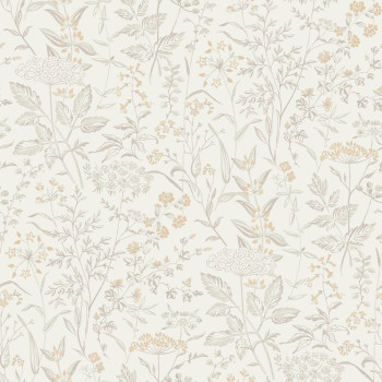 Non-woven wallpaper with a delicate pattern of flowers and grasses in beige tones.