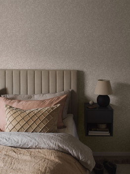 Non-woven wallpaper with a delicate pattern of flowers and grasses in soft grey-brown tones.