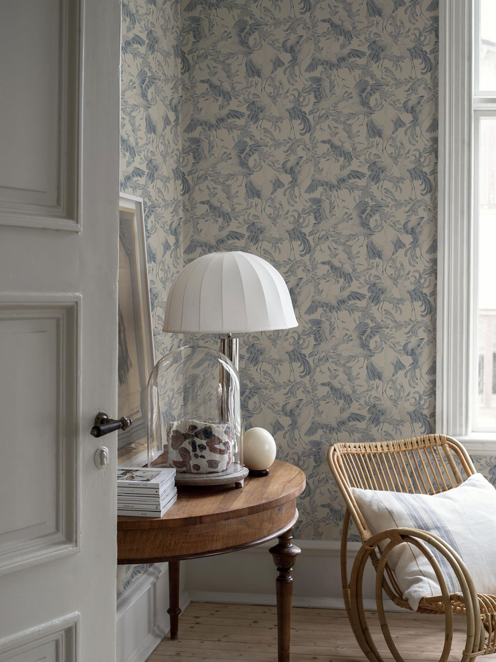 Wallpaper with a motif of a dancing crane in a contrasting palette of inky blue and ivory white.