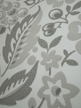Non-woven wallpaper, cream background, folk-inspired motifs of flowers, leaves and fruits, in grey-beige tones.