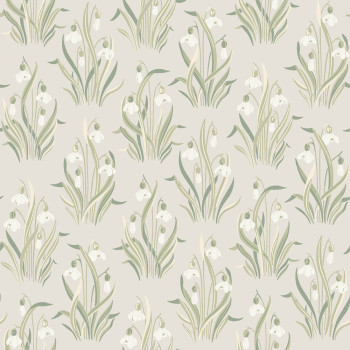 Non-woven wallpaper, light beige background, snowdrop motif.