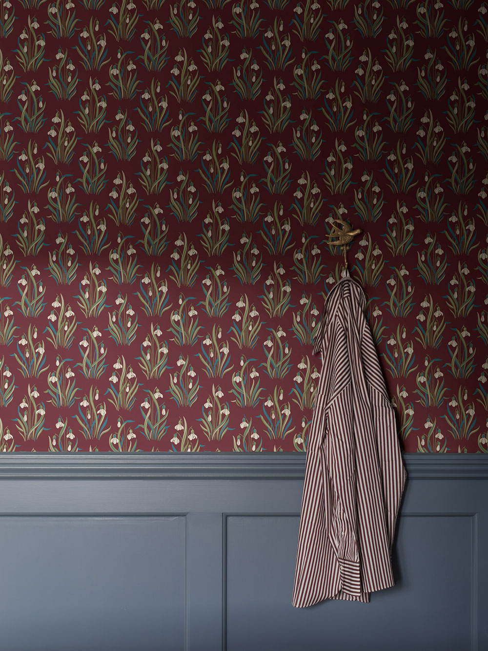 Non-woven wallpaper, burgundy background, snowdrop motif.