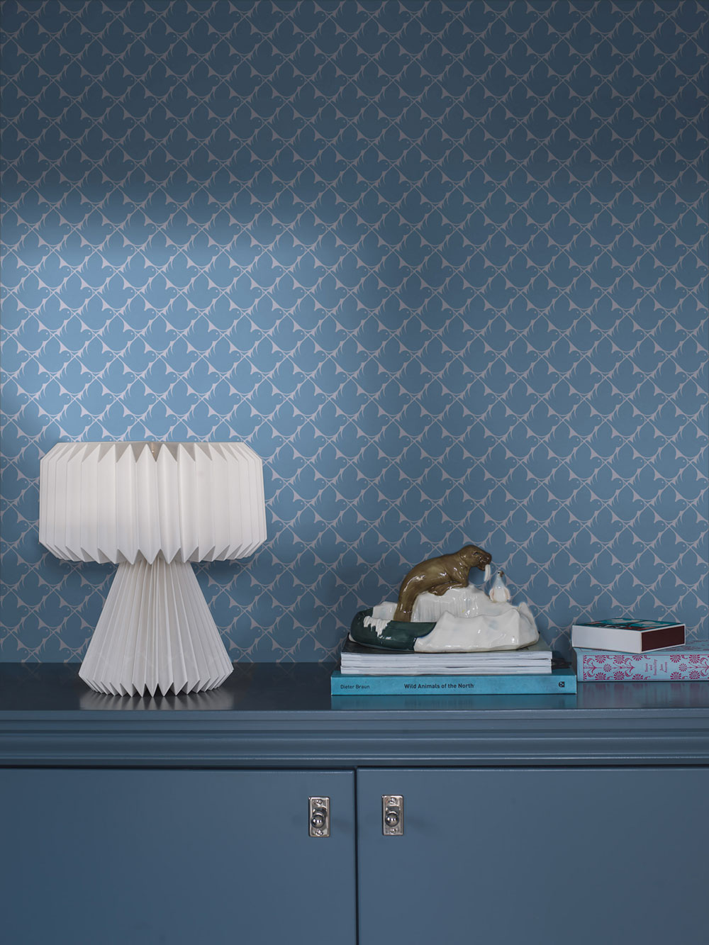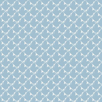 Non-woven wallpaper, white and blue grid pattern with stylized birds.