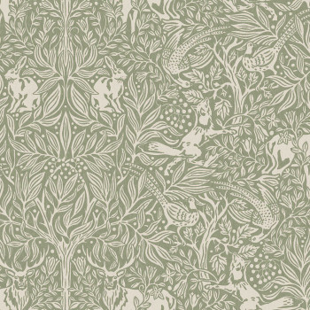 Wallpaper with a motif of forest animals among trees and leaves, in sage green and beige shades.