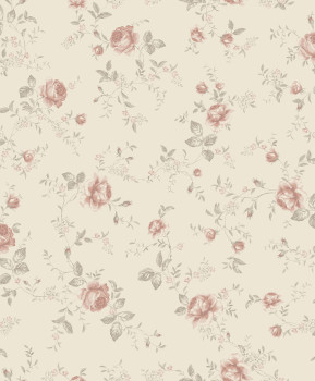 Wallpaper with a creamy light beige background and rose motifs in shades of brown and pink.