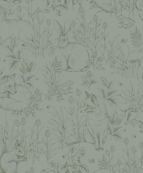 Children's wallpaper with a green background featuring outlines of forest animals and plants.