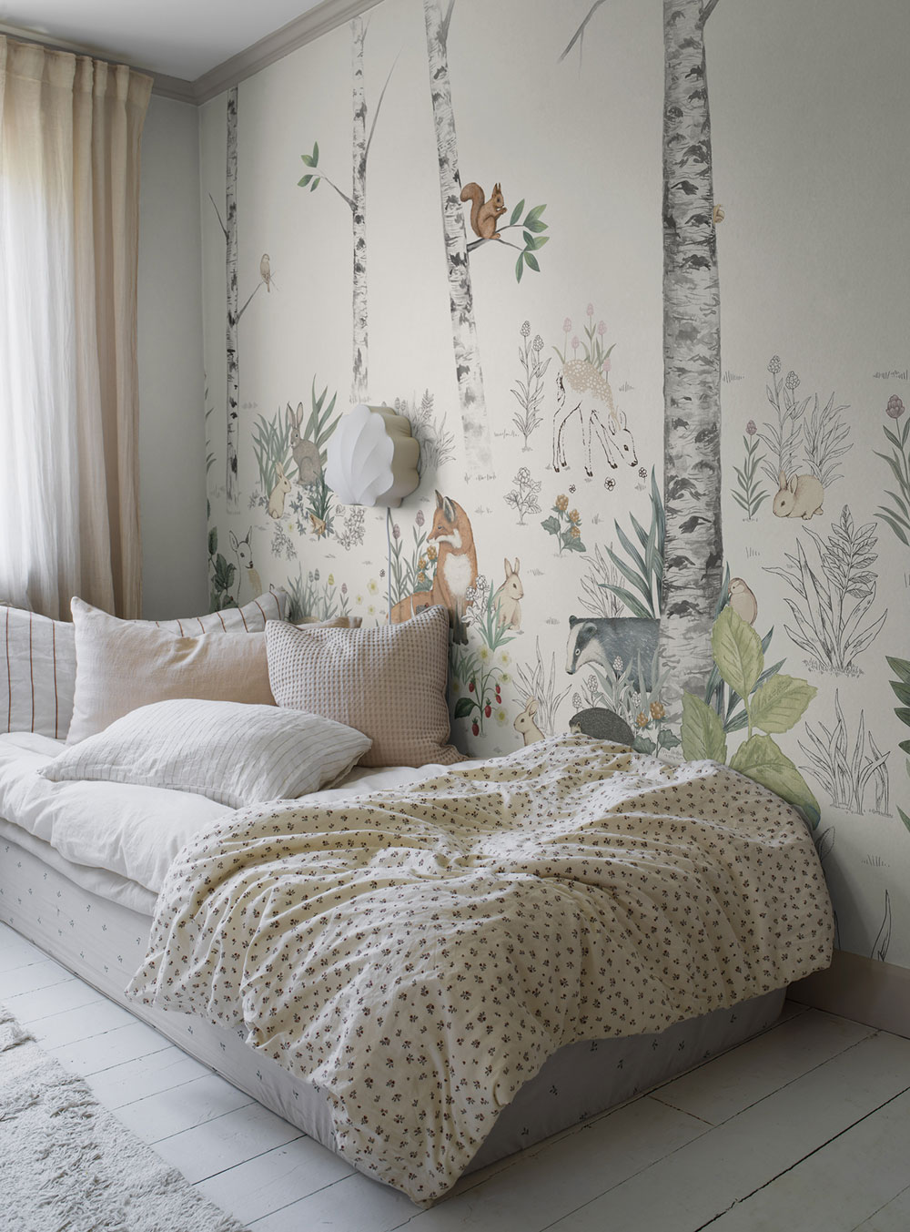 The colour palette is soft and soothing – subtle greens, beiges, blues and browns create a harmonious space that inspires imagination while promoting calm before bedtime. These wallpapers are ideal for nurseries, playrooms and cosy corners – and will grow with your child.