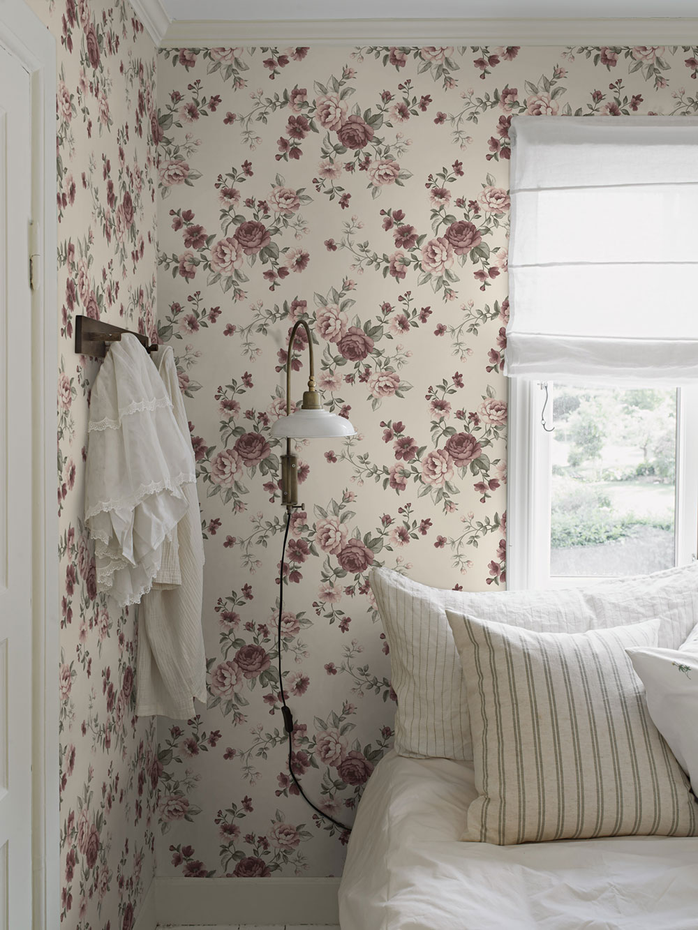 Wallpaper with a cream background and rose motifs in shades of green, burgundy, and pink.
