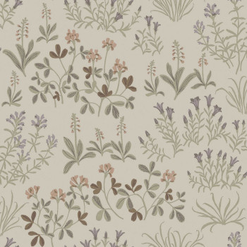 Wallpaper, grey-beige background, meadow flowers in shades of green, brown, muted purple and pink.
