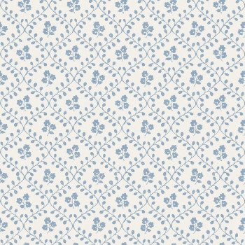 Wallpaper, ornamental floral motif inspired by traditional embroidery, shades of cream white and blue.