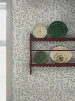 Wallpaper, cream background, motif of blooming wisteria in shades of purple and green.