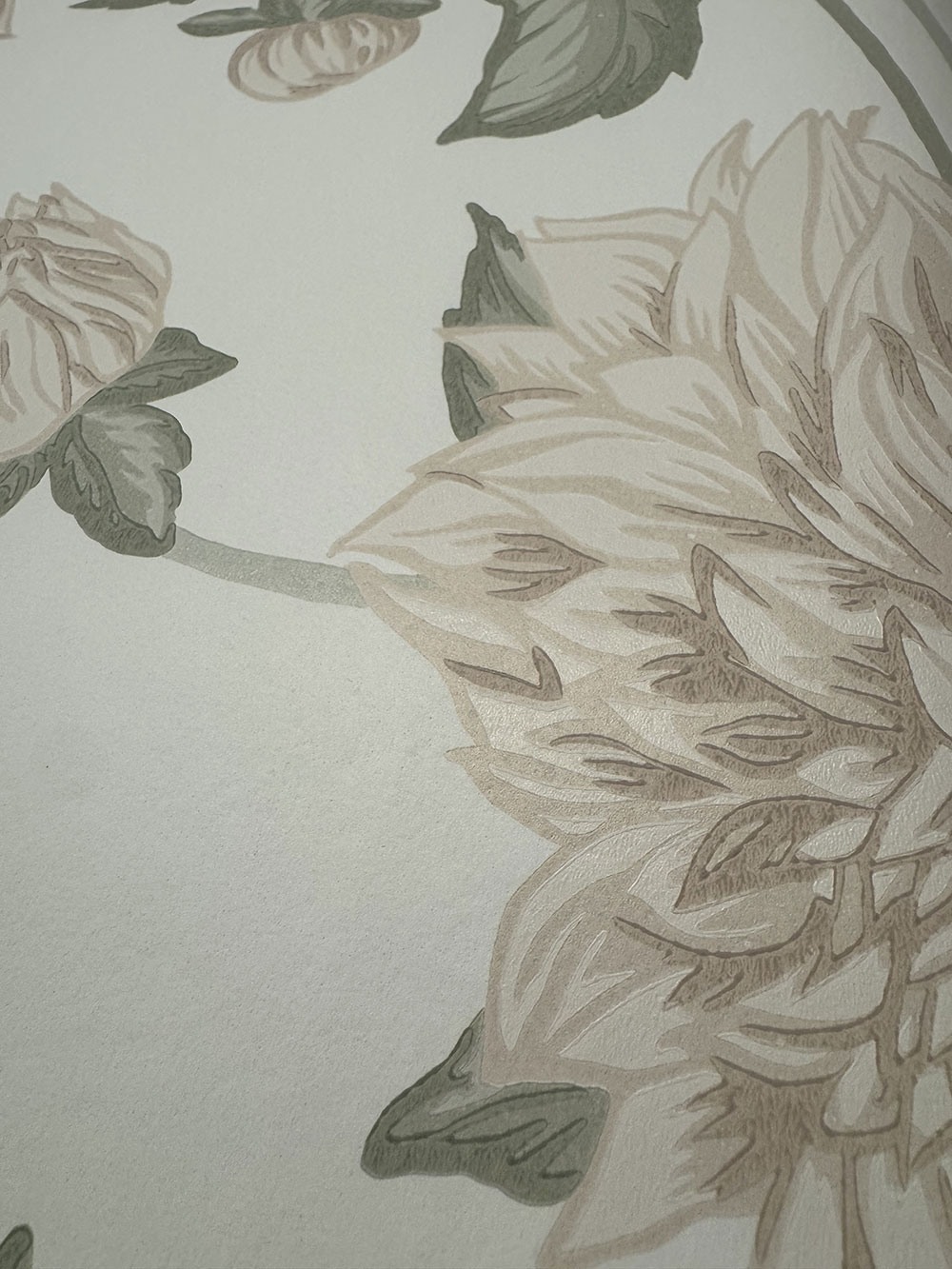 Wallpaper, cream background, blooming dahlia motif in green and apricot pink shades.