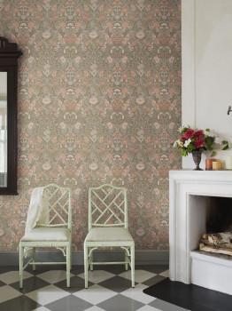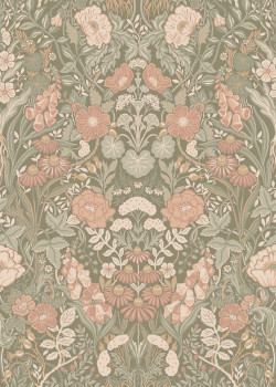 Wallpaper, khaki background, rich floral pattern in shades of green, pink, beige and grey.