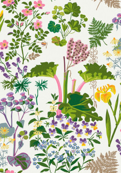 Wallpaper with a white background, floral and leaf motifs in shades of green, blue, pink and purple.