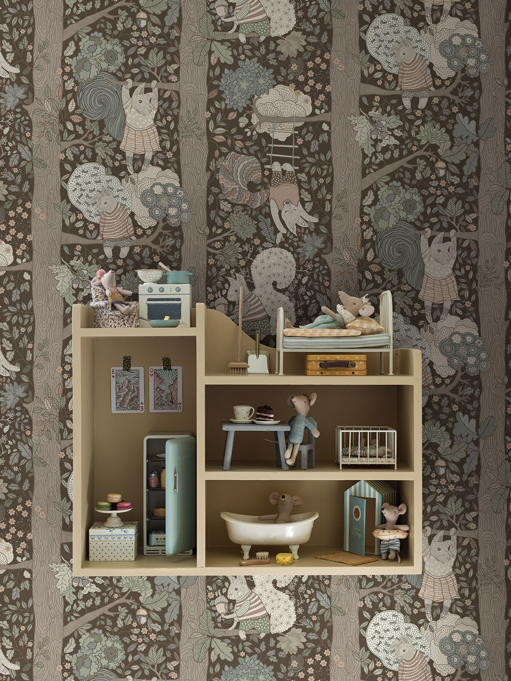 Wallpaper with a brown background, playful squirrel motif in soft pastel shades of green, beige and brown.