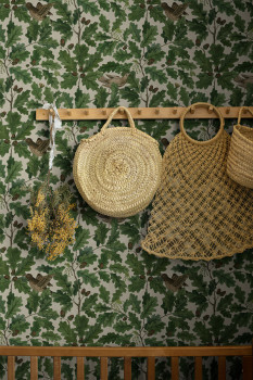 Wallpaper “In the Oak” on a beige linen background, contrasting with dark green and brown tones of flora and fauna motifs, a modern interpretation of medieval tapestries and Arts and Crafts patterns.