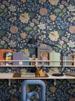 Wallpaper with a dark blue background, rich floral pattern in shades of green, blue, beige and apricot.