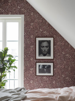Wallpaper with a pattern of flowers, fruits and leaves in shades of burgundy and pink, with delicate gold details, inspired by a design from the 1950s.
