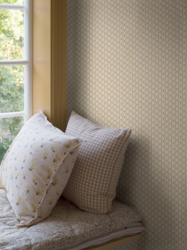 Non-woven wallpaper for walls, white background, yellow vine stripes with flowers.