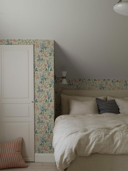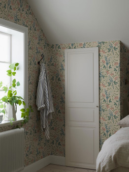 Non-woven wallpaper for walls, beige background, floral pattern in shades of green, blue and pink.