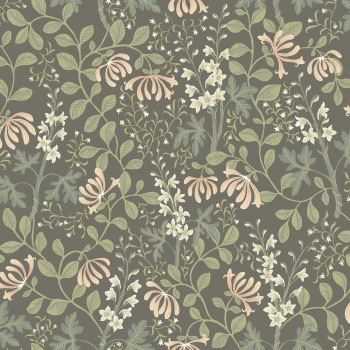 Non-woven wallpaper for walls, beige background, floral pattern in shades of green, beige and pink.