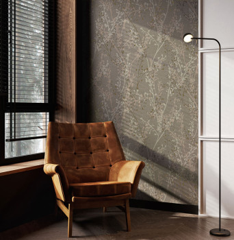 Wallpaper with a brown-beige fabric texture and embossed twigs in grey, beige and golden beige.