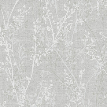 Wallpaper with a grey fabric texture and embossed twigs in grey, grey-silver and gold.