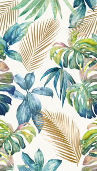 Non-woven mural wallpaper with vinyl surface, tropical leaf pattern.