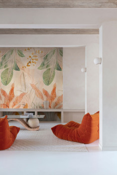 Non-woven mural wallpaper with vinyl surface, leaf motif in green, ochre, orange, pink and terracotta shades.