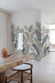 Non-woven mural wallpaper with vinyl surface, tropical leaf pattern.