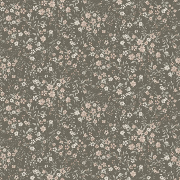 Wallpaper with a brownish-grey background and floral motifs in beige-pink and light green shades.