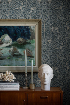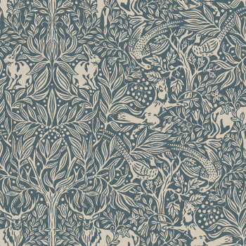 Wallpaper with a motif of forest animals among trees and leaves, in blue and beige shades.