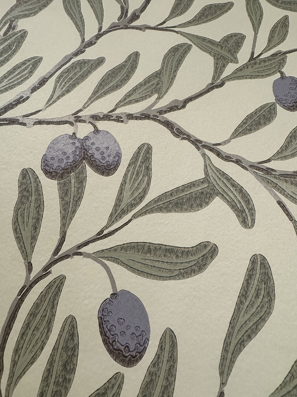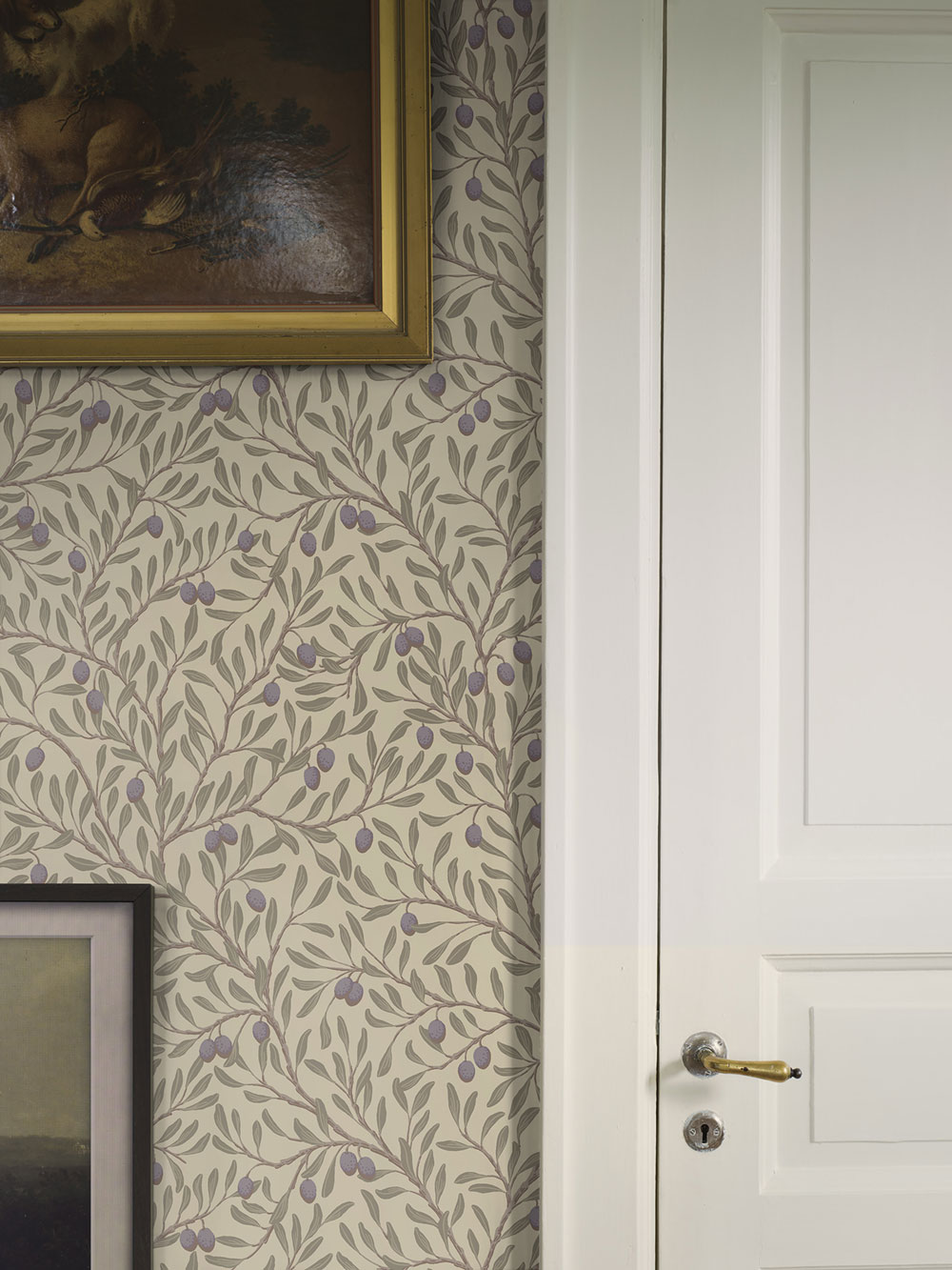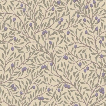 Wallpaper, yellow-green background, motif of an olive tree with ripe fruits.
