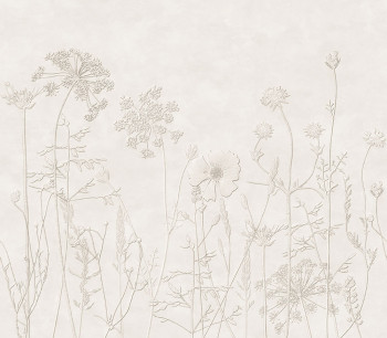 Mural wallpaper, pattern of blooming flowers and meadow grasses in cream and white tones.