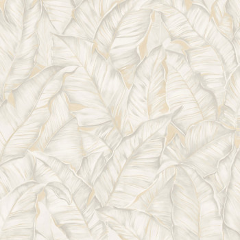 Luxury wallpaper with a vinyl surface, embossed leaves in shades of white, grey and beige with subtle gold highlights.