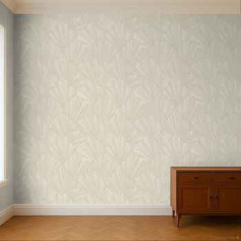 Non-woven wallpaper with vinyl surface, semi-gloss cream and light beige shades, embossed fan pattern.