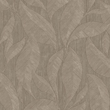 Non-woven wallpaper with vinyl surface, brown shades, subtle semi-gloss in places, embossed stylized leaves.