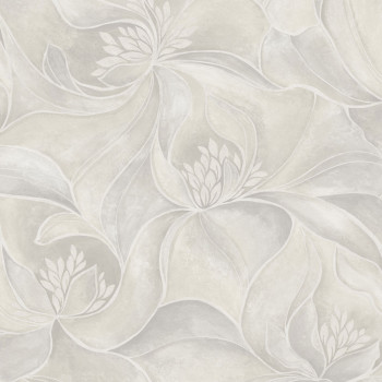 Non-woven wallpaper with vinyl surface, grey shades, silver semi-gloss details, embossed stylized flowers.