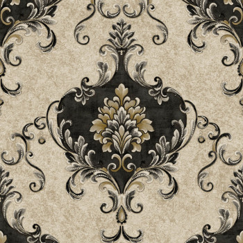 Non-woven wallpaper with vinyl surface, light grey-beige background, black and brown pattern with subtle glitter.