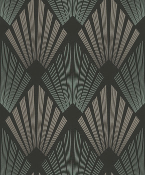 Wallpaper with a slightly embossed Art Deco pattern in black shades, green lines in the design, matte and metallic semi-gloss finish.