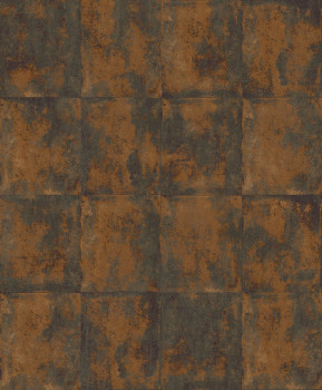 Wallpaper with a concrete tile design in brown shades with bronze accents.