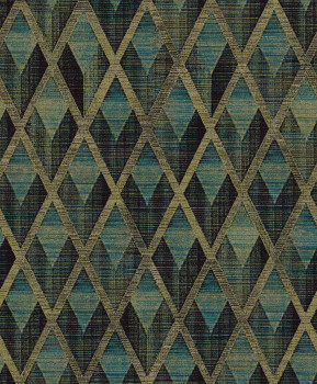 Wallpaper with a geometric pattern in shades of green and semi-gloss gold.