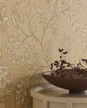 Non-woven wallpaper with textile texture, ornamental floral pattern in shades of brown, beige, terracotta, with an orange hue.