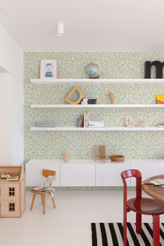 Non-woven wallpaper with a floral pattern in turquoise, green, blue and ochre yellow shades, white background, fabric look and texture.