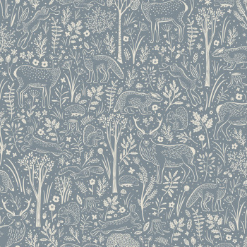 Non-woven wallpaper with forest animals, trees and plants pattern, fabric look and texture.
