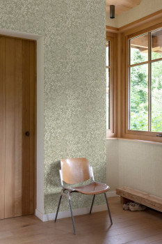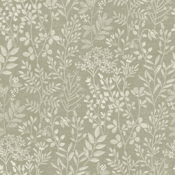 Wallpaper with a vinyl surface, sage green background with fabric texture, motifs of meadow grasses and leaves.