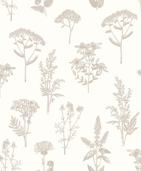 Wallpaper with a vinyl surface, white / ivory background, metallic silver pattern – meadow flowers and grasses.